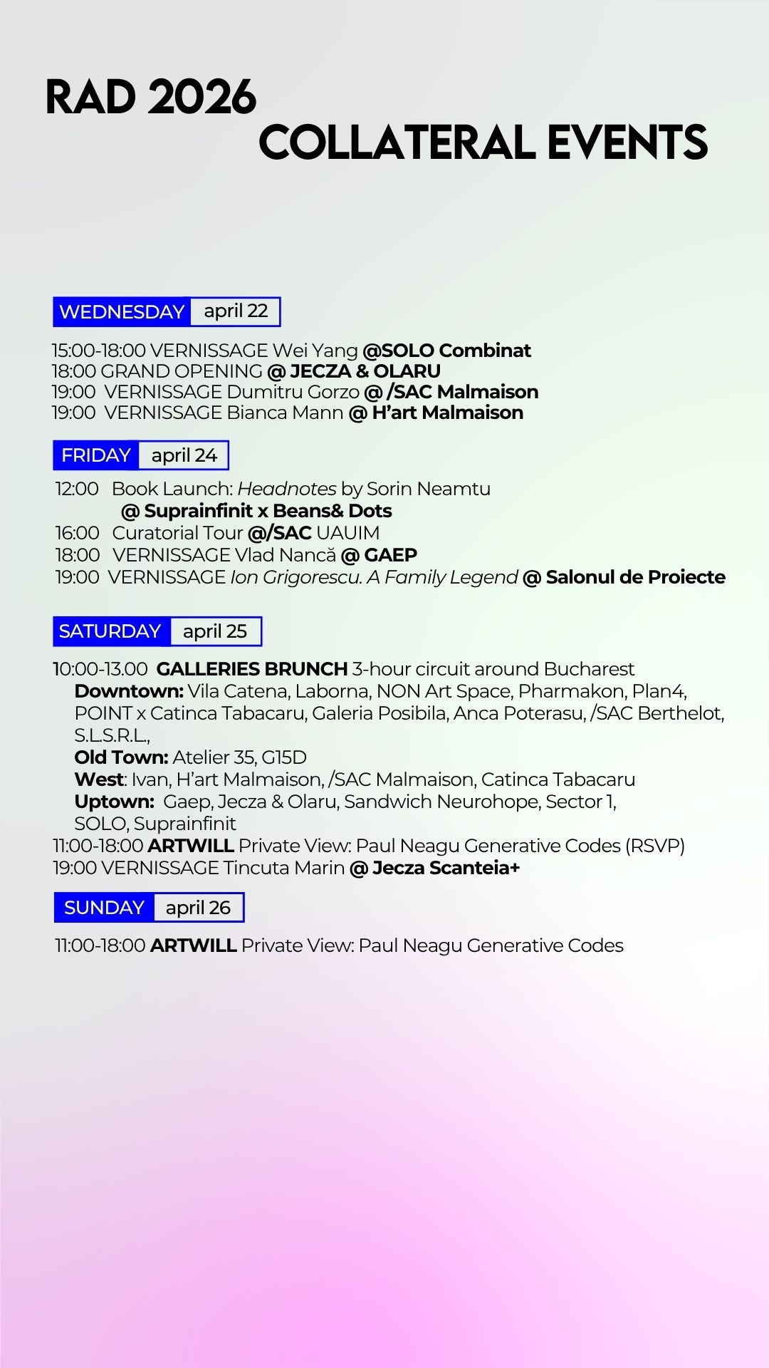 In 2026, RAD continues to expand its international reach while refining its format through a more focused, minimal approach to programming. Strengthened global partnerships and a growing international audience contribute to positioning Bucharest as an active node in the contemporary art conversation.