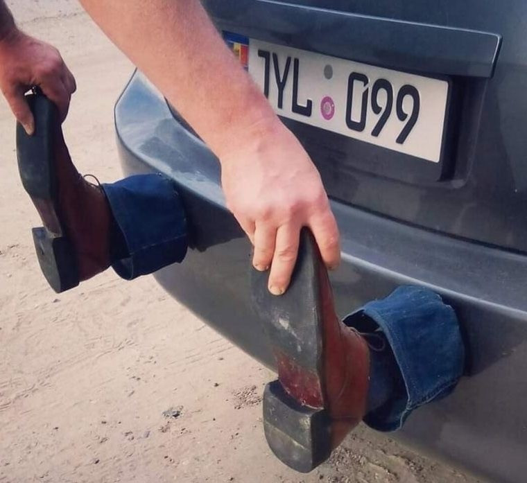 Bumpers is a satirical commentary on solving mundane problems, part of Verlan's practice of reinventing objects and their meanings. Designed as a pair of legs with shoes on, that prevents impacts or collisions with other cars. This playful piece highlights the absurdity of innovating.