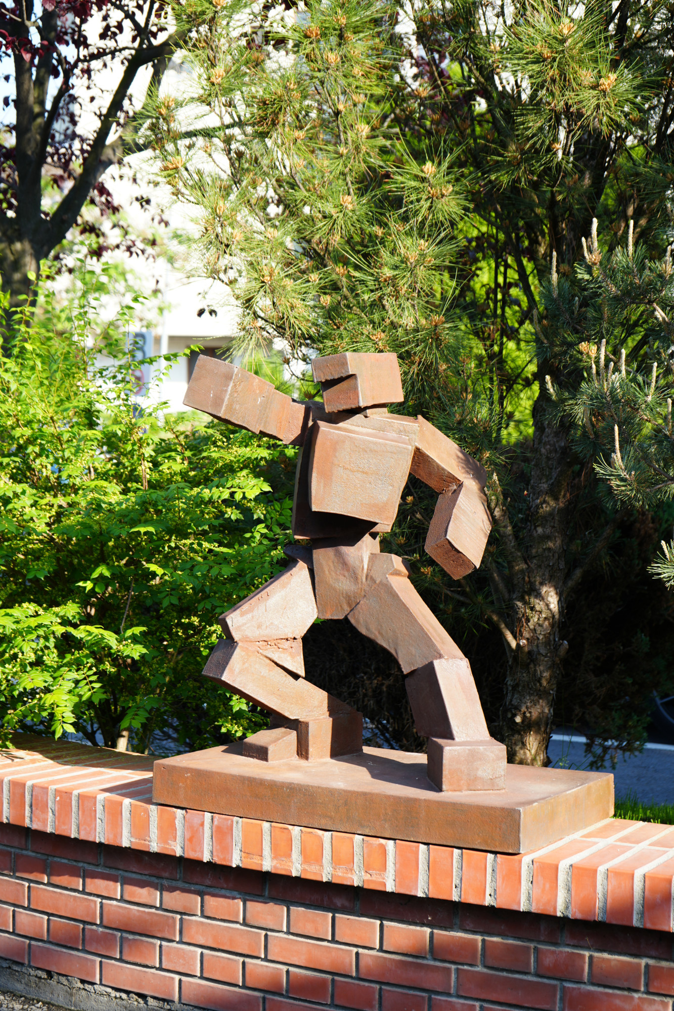 Rebelious forms in Space, inspired by heroic poses of traditional sculpture, blends influences of cubist and futurist aesthetics. Its fragmented, geometric form conveys a sense of motion and dynamism, breaking away from classical representation. The choice of ignoble materials, mimicking iron, challenges traditional notions of monumentality, giving the piece an industrial and rebellious character.