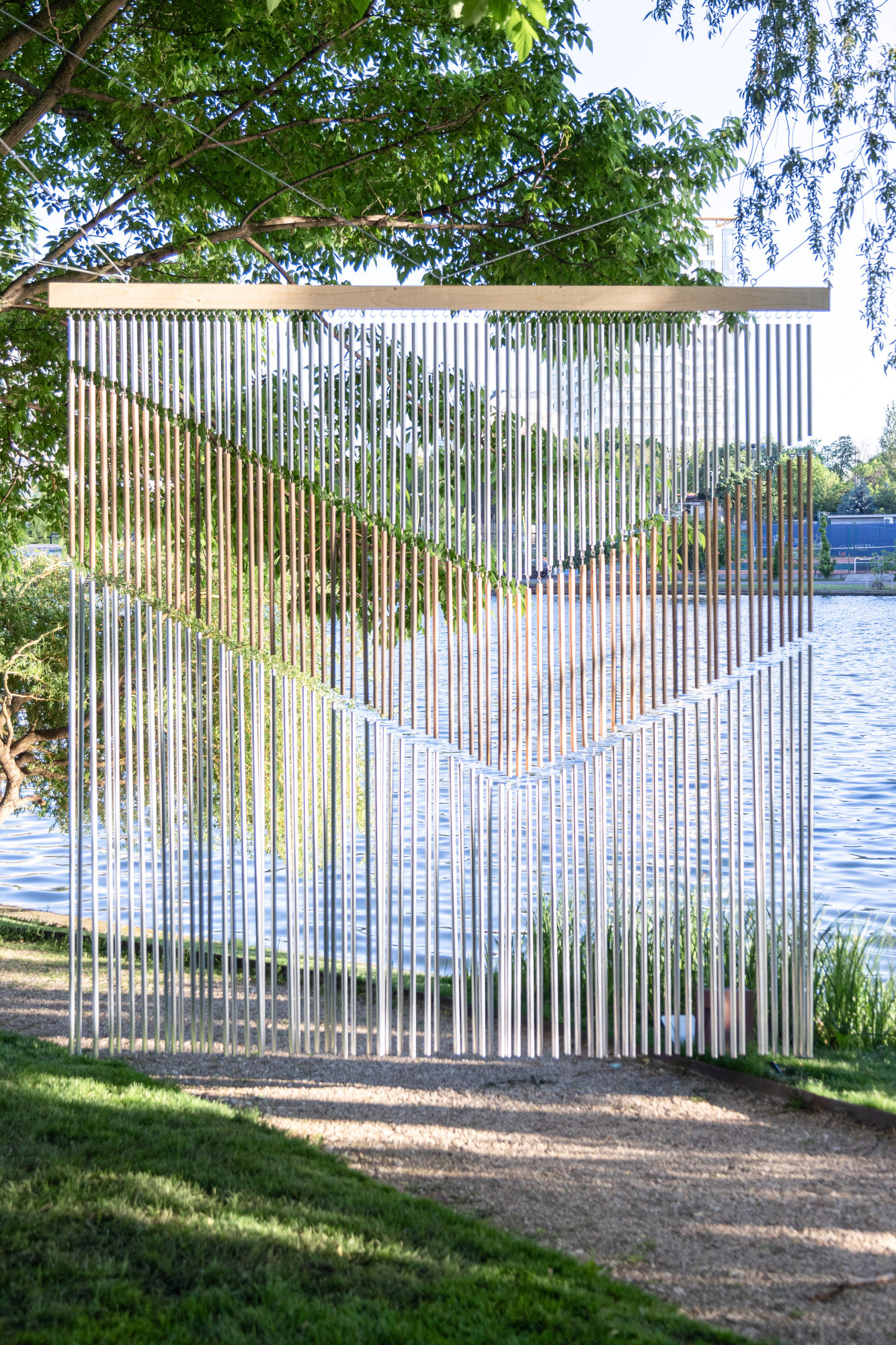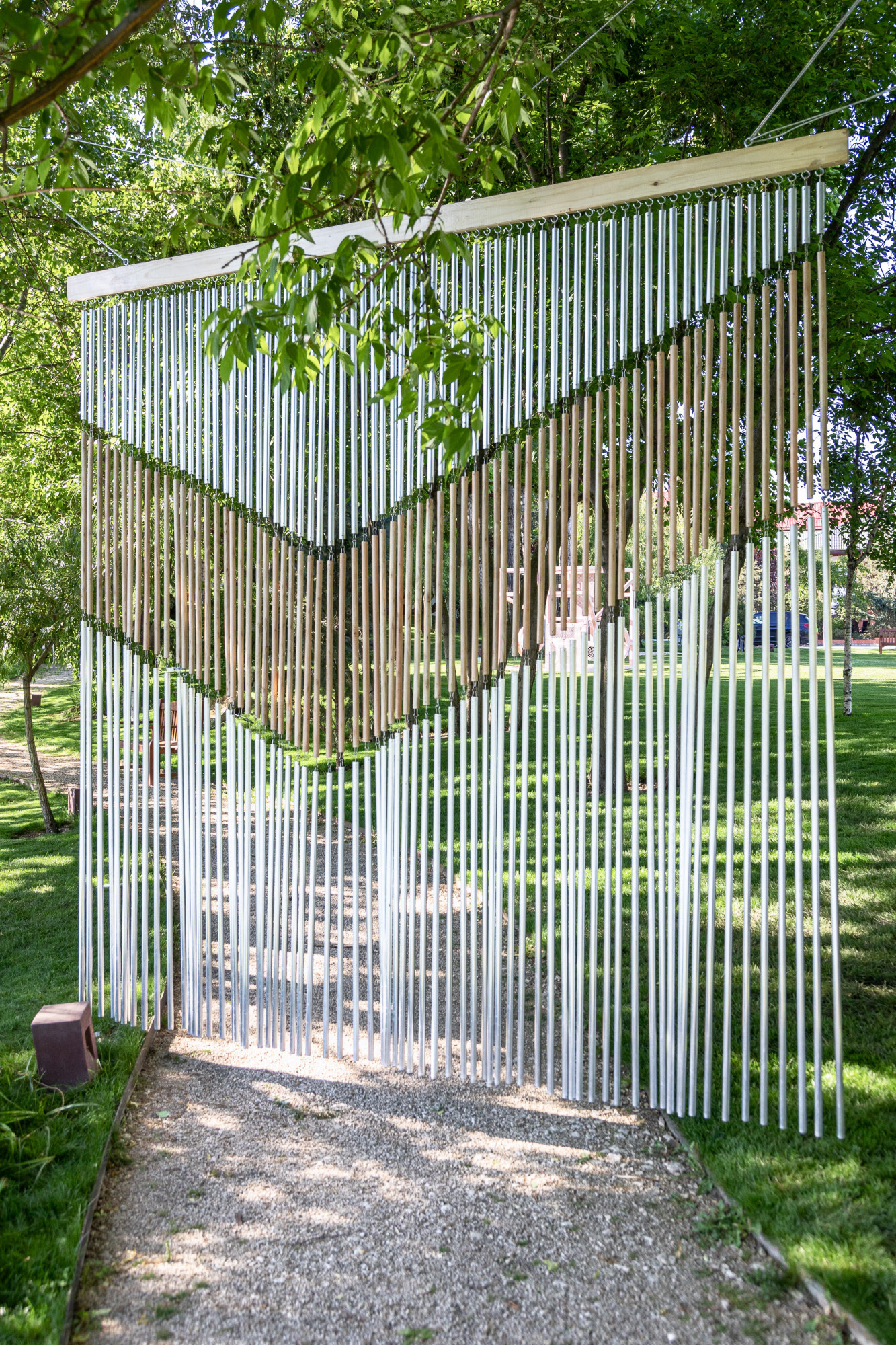 Leaving behind the "Windbell or the Simulation of Paradox" series, in which interactive installations were deliberately left entirely uncontrolled, the paradigm shifts in the proposed work. This marks the first object in which sounds are relatively regulated, with frequencies varying from one element to another, allowing the possibility of playing with different tunes.This reinterpreted object is now placed within a natural environment, where it is influenced not only by human interactions but also by weather. At its core, this work serves as a portal to childhood, a space where instinct is given free rein—recalling a time when exploration was driven purely by the pursuit of joy. It seeks to evoke sensory experiences unmediated by judgment, immersing the participant in the immediacy of the present moment. The work alludes to the tactile memory of plunging hands into sacks of wheat and beans at the market or the uninhibited curiosity of encountering a musical instrument for the first time, engaging with it intuitively despite a lack of formal knowledge.